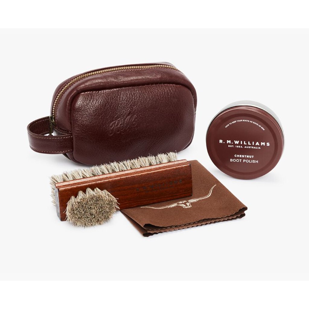 Keep your collection of R.M.Williams boots well cared for with the Mini Travel Care Kit. The Kit comes in a full grain leather mini travel bag with R.M.Williams script logo debossing and includes Double Sided Polish Brush, Stockmans Boot Polish & a polish cloth.