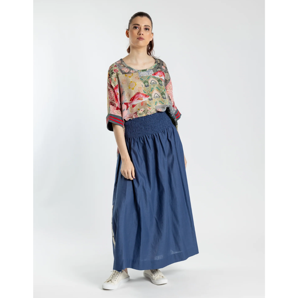 This relaxed fit skirt features a shirred elasticated waist, falls beautifully from the hips and is a great length.