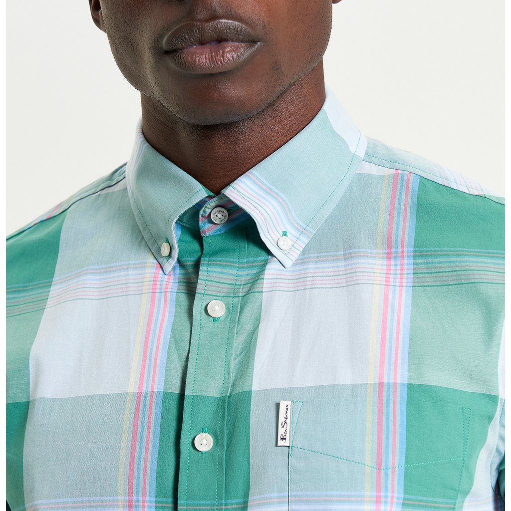 This short sleeve multicolour overcheck shirt features a curved hem and a three finger button down collar. Made from 100% organic cotton, this regular fit shirt is completed with a ˜Ben Shermanâ™ branded woven label at the chest pocket